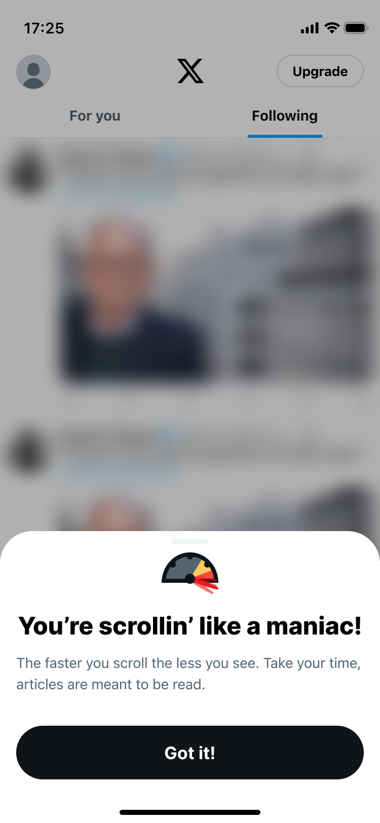 Like other social media apps, X suggests a choice between two different feeds: The “Following” and the “For You” page. The "Following" tab adheres to a mostly linear feed structure, presenting posts in a chronological order. This linear approach provides a real-time perspective on updates from followed accounts. However, this design also incentivizes frequent activity, as older posts can quickly become buried under new content.