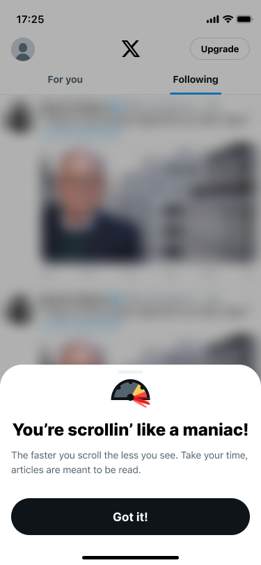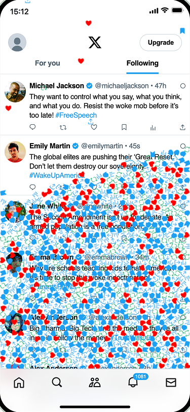 In this section, we disrupt the familiar interface patterns of X by using a combination of interface design and speculative design. Our approach doesn’t seek to completely reinvent the wheel but instead plays with the existing elements and logic of the platform. By drawing on X’s own design features, such as colors and interactive patterns, we intend to critique the current user experience. This is done by introducing friction – an intentional slowdown in the interface – that challenges the rapid-fire, mindless engagement that X has cultivated. Through these small, strategic disruptions, we hope to "beat X at its own game," using the platform's own design elements to shift user behavior and prompt a more thoughtful, self-aware interaction.