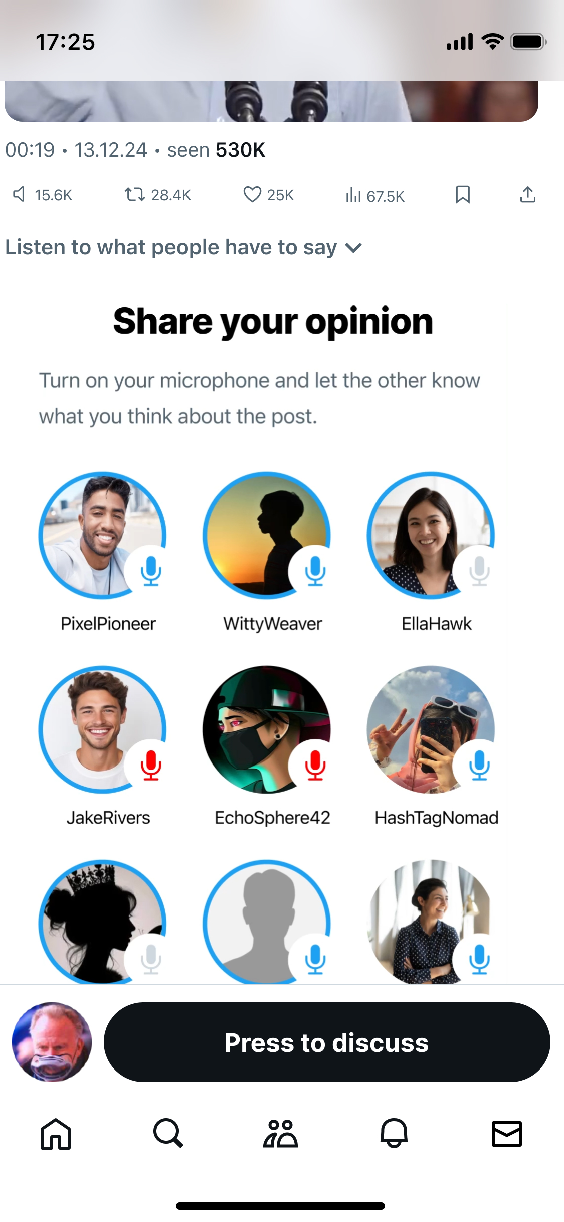 If you check out the mobile screen animation, you'll notice that instead of the usual comment section, there's a new way to share your opinion on a post. If you are familiar with the Social Media App “Clubhouse”, you will see a similar principle here. As commenting in social media, is a metaphor for a discussion in real life, but stems from a time, when the internet was providing mostly textual content, we can rethink this in nowadays technological context: In a world of video, live streaming and constant connection, users can join a digital room for live video meetings, creating a setting where specific phrases cannot be isolated and used to frame or misrepresent conversations. Our goal is to foster a more chaotic discussion culture on X, one that dampens engagement while introducing a richer, more vibrant dynamic to the platform’s beloved comment section. Will there even be breakout rooms to imitate the iconic threaded structure of X? Or could you just open a room, when you disagree with a specific side note in that discussion?