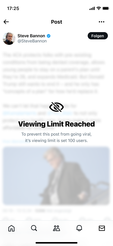 If you look at the mobile screen on the right, you'll notice the feed content is no longer visible – because the view limit has already been reached. When the number of, for instance, 100 views is reached, the post becomes blurry, rendering it unreadable, and it can no longer be retweeted. This approach would act as a speed bump in the rapid dissemination of content, encouraging users to engage more thoughtfully and reducing the potential for harmful or inaccurate information to gain traction. Introducing an access limit on each post would prevent posts from going viral and stop the spread of misinformation.